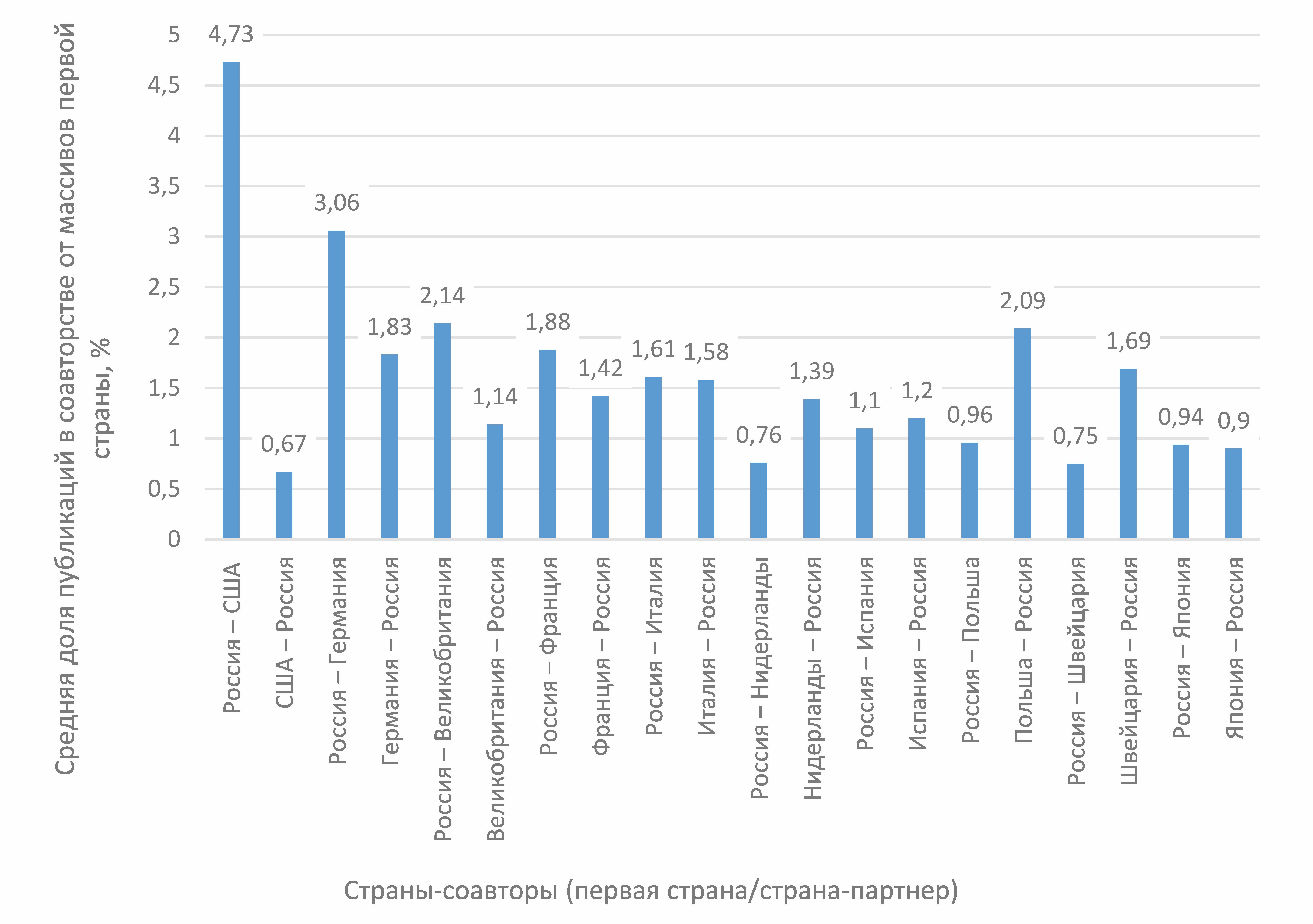 2. Рис. 2. Двустороннее сотрудничество. Средняя доля публикаций в соавторстве от массивов первой страны за период 2019–2023 гг. Страны группы 1, база данных OpenAlex.