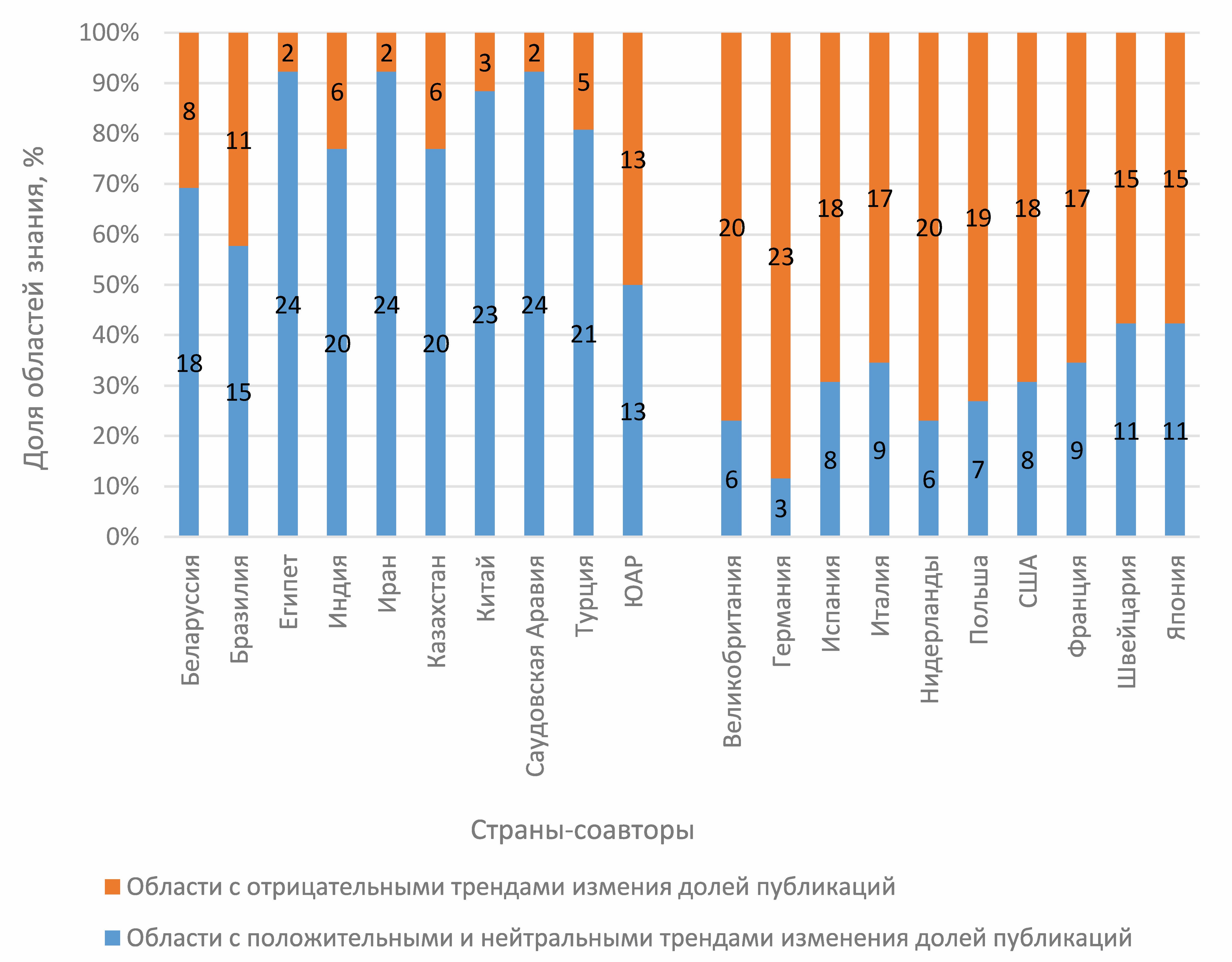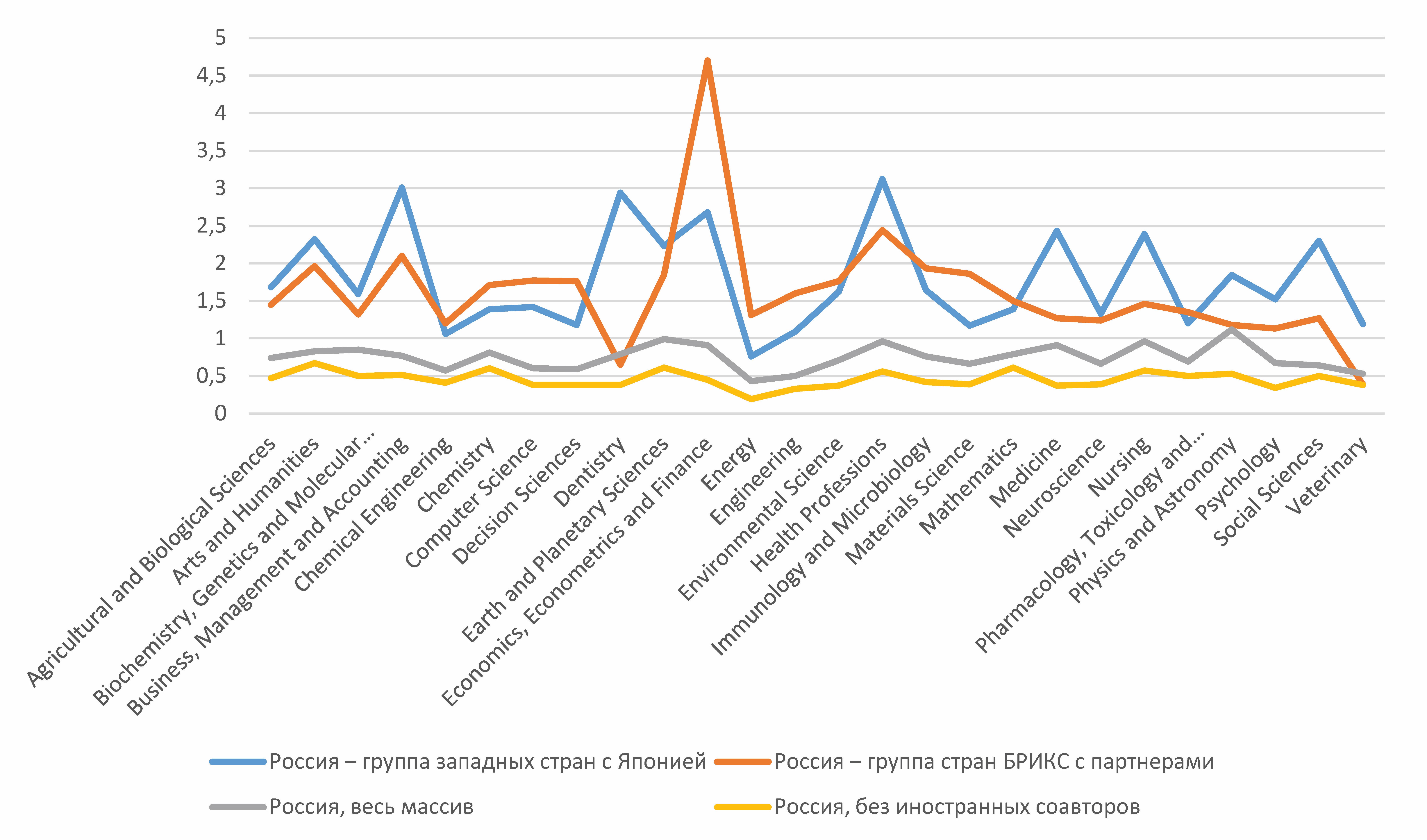 Сотрудничество в науке имеет фундаментальное значение и часто считается необходимым условием для повышения качества исследований. Определение меняющихся тенденций международного взаимодействия ученых ‒ одна из наиболее актуальных задач наукометрии. Цель исследования: определение трендов совместной публикационной активности российских авторов с основными странами-партнерами. Задачи исследования: 1) сравнение динамики изменения потоков совместных публикаций российских ученых с коллегами из стран объединения «БРИКС плюс» и из некоторых западных стран и Японии; 2) определение «веса» массивов публикаций согласно их уровню цитируемости на мировом фоне. Объект исследования: массив российских публикаций в соавторстве с учеными из стран «БРИКС плюс», а также ‒ из ряда западных стран и Японии. Информационная база: открытый ресурс OpenAlex. В ходе исследования обнаружено, что соавторство российских ученых с представителями группы западных стран и Японии активно снижается по всем областям знания, хотя в количественном выражении до сих пор находится на высоком уровне. Уровень цитируемости документопотоков в соавторстве с представителями из этой группы стран оказался выше среднемировых показателей по 14 из 26 научных областей. Несмотря на то что совместная публикационная активность со странами «БРИКС плюс» находится пока на низком уровне, средний уровень цитируемости публикаций с представителями этой группы стран в 12 областях знания превышал среднемировые показатели, что говорит об ощутимом выгодоприобретении от научного сотрудничества с этими странами. С представителями этой группы стран наблюдался (в большей или меньшей степени) рост совместной публикационной активности по всем областям знания. Изучение двусторонних публикационных связей показало, что соавторство с российским коллегами вносит большой вклад в национальную науку этой группы стран и особенно ‒ Белоруссии и Казахстана.