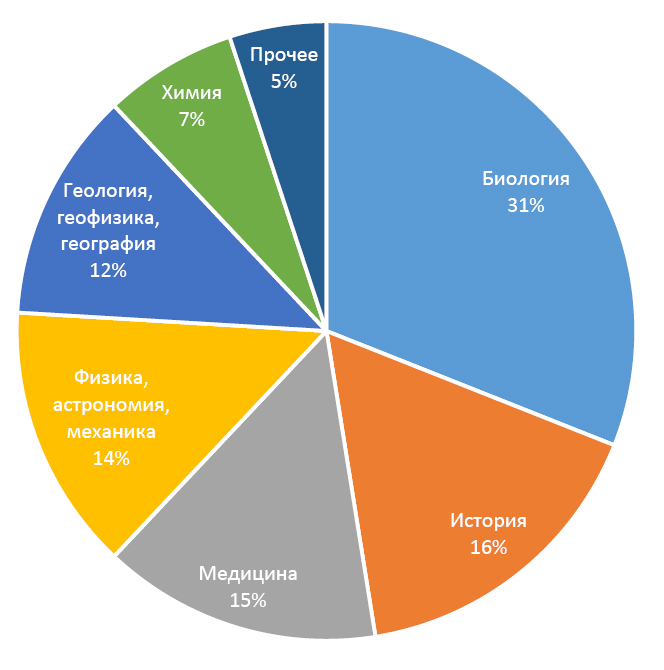 1. Рис. 1. Тематическое распределение статей в журнале «Наука из первых рук» за 2018–2022 гг. | |