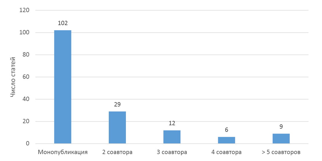 2. Рис. 2. Распределение числа соавторов в статьях журнала «Наука из первых рук» за 2018–2022 гг. | |