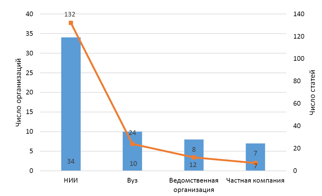 3. Рис. 3. Российские организации авторов с публикациями в журнале «Наука из первых рук» в 2018–2022 гг. Столбцы – организации, линия – число статей | |