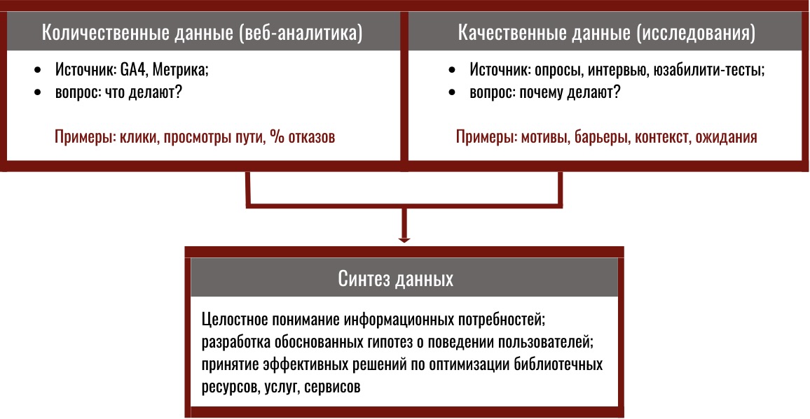 Ярутич Д.А. Преодоление интерпретационного разрыва в веб-аналитике научной библиотеки посредством циклической модели синтеза количественных и качественных данных. Библиосфера. 2025;(4):118-126. https://doi.org/10.20913/1815-3186-2025-4-118-126