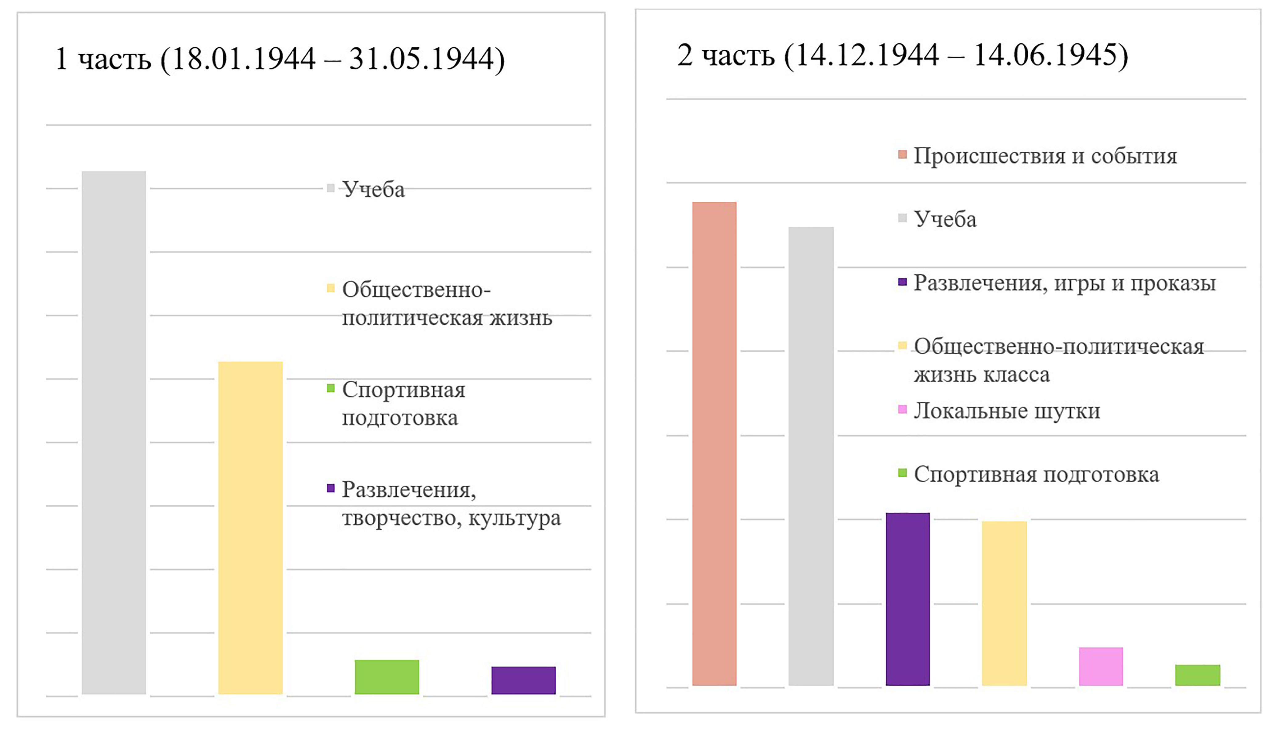 3. Рис. 3. Соотношение записей разной тематики в первой и второй частях Болотнинского дневника | |